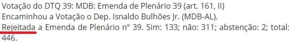 A emenda foi rejeitada por 311 deputados, contra 133 que a aprovavam.